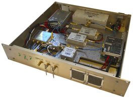 The original AMiBA telescope began with 14 of these 1st section modules and was expanded to 26 modules in 2009 to support 13-element dual polarization receivers. This photo is of the 1st Section module designed to fit into a standard Eurocard chassis. The black heatsink shown in the photo was later increased in size to facilitate cooling of the Celeritek power amplifier (D. Kubo, P. Oshiro).