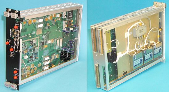 2001 contract - Photo of Clock Recovery Module front and rear without covers. As a contractor, I received this interesting design task to update and repackage their existing clock recovery design into this VXI form factor to support their new ground station receiver product line. The module supported 4 symbol rates with the last slot unused. The design supported multiple modulation formats with stringent phase noise and Eb/No acquisition requirements. Fortunately, I had the assistance of a board layout person along with a mechanical engineer for packaging (D. Kubo, et al).